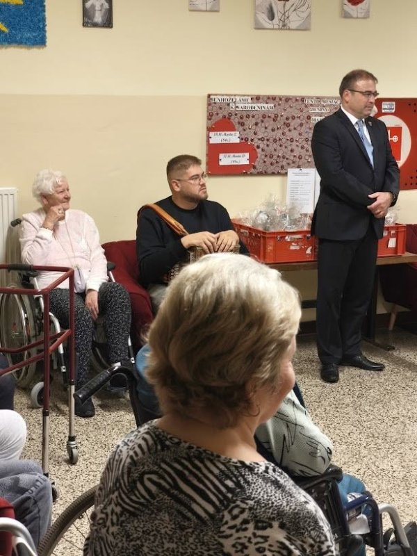 Záver októbra patril vzácnej návšteve – Ing. Radoslav Vazan, primátor mesta Krupina potešil našich seniorov malými darčekmi a Mgr. Peter Sedmák hudbou a spevom.