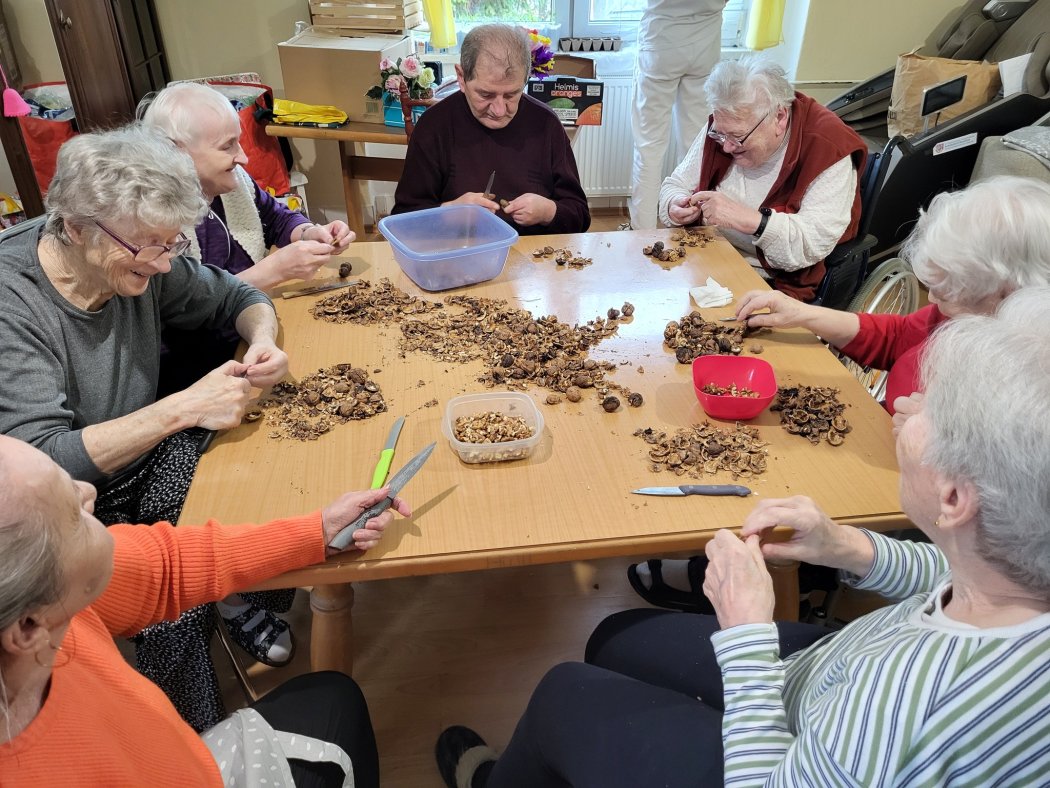 Rovnako radostné bolo aj spoločné spievanie v rámci muzikoterapie, ktoré rozospievalo celé naše zariadenie. Známe ľudové melódie navodili pohodovú atmosféru a priniesli úsmev na tvárach všetkých zúčastnených. Po príjemnom dopoludní, ktoré nás nabilo energiou sme sa poobede pustili do ďalšej manuálnej činnosti – čisteniu orechov. Spoločné lúskanie a triedenie jadierok prebehlo v priateľskej nálade plnej smiechu a pohody. Výsledné jadierka nám potom poslúžili na neskoršie pečenie. Presne takéto chvíle nám pripomínajú, že spojenie pohybu, spevu a vzájomnej blízkosti je tou najlepšou formou terapie.